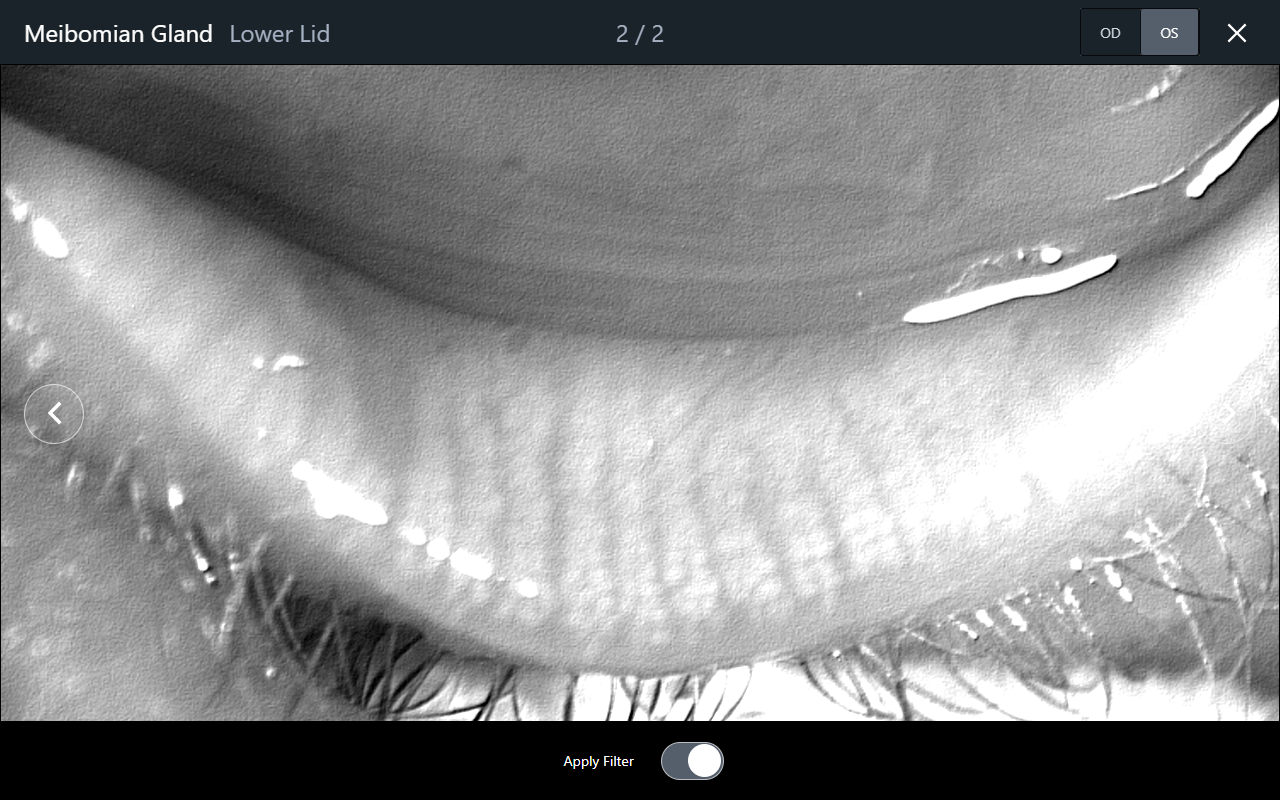 Es besteht die Möglichkeit ein Bild aufzunehmen, um die Funktionsfähigkeit und Struktur der Meibom-Drüsen zu beurteilen. ZEISS VISUREF 600 ermöglicht die Anwendung eines Filters, mit welchem die Meibom-Drüsen besser sichtbar gemacht werden.