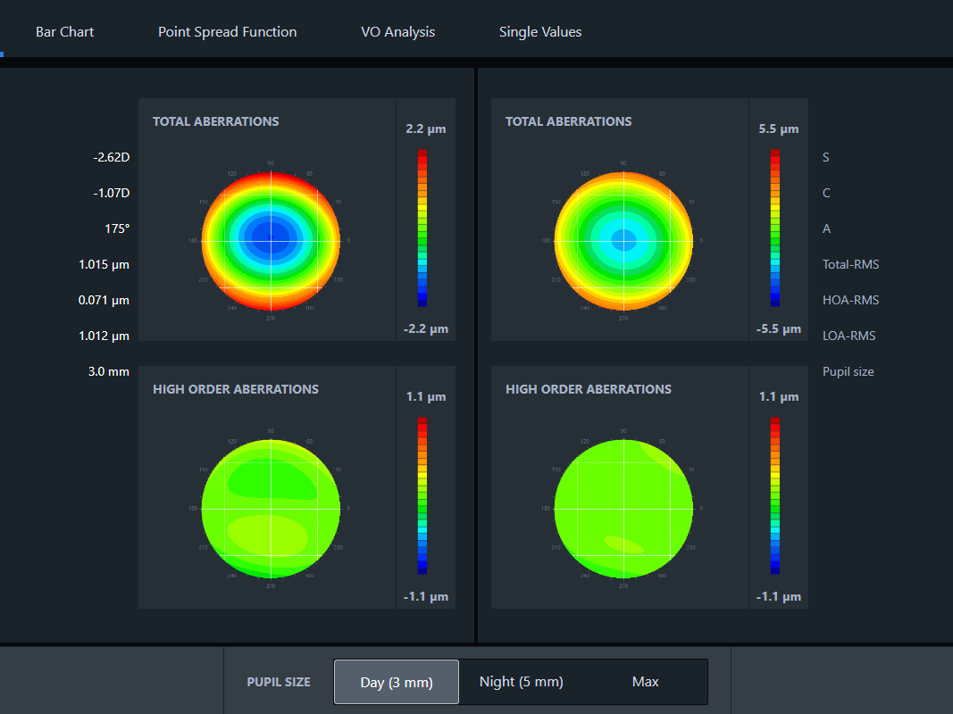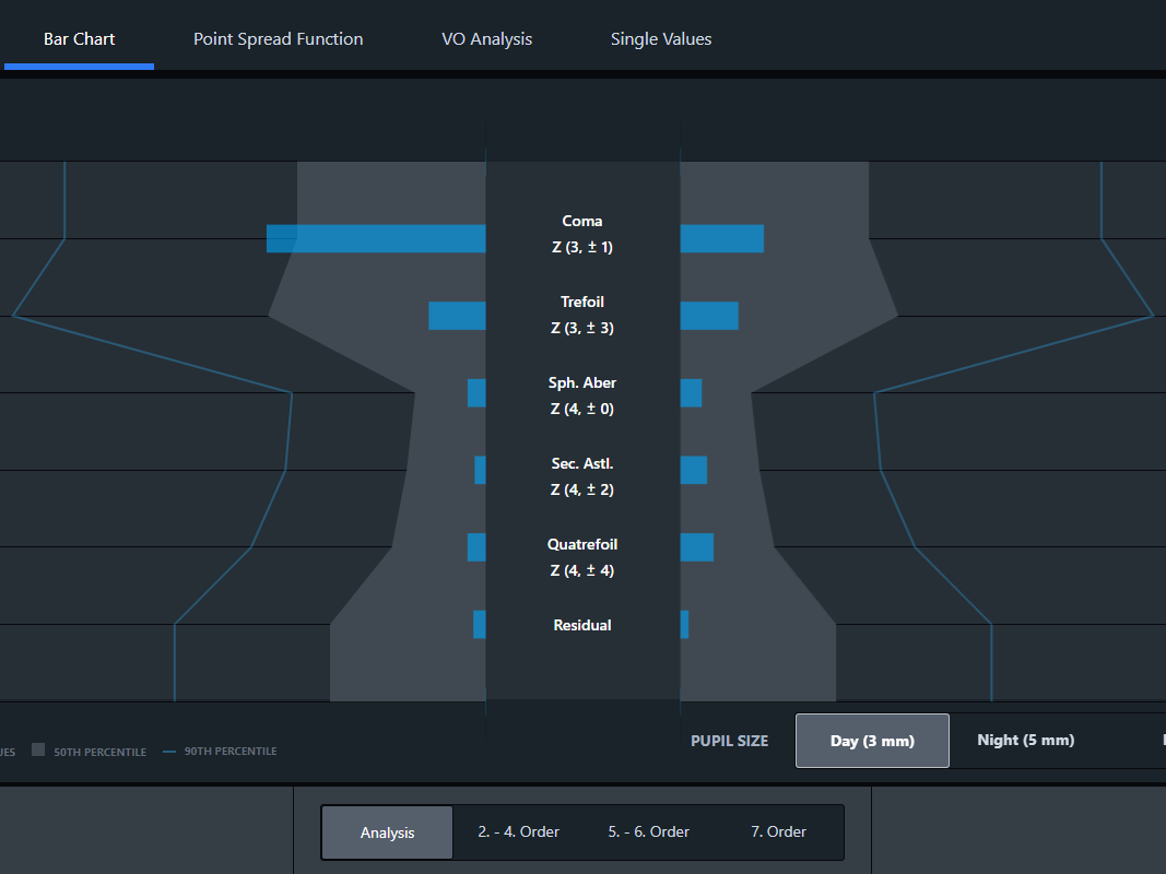Die Analyse der erfassten Daten ermöglicht es, für die Augen die Refraktion mit den entsprechenden Sphären-, Zylinder- und Achsen-Werten zu berechnen sowie Aberrationen höherer Ordnung mithilfe von Zernike-Polynomen zu identifizieren.