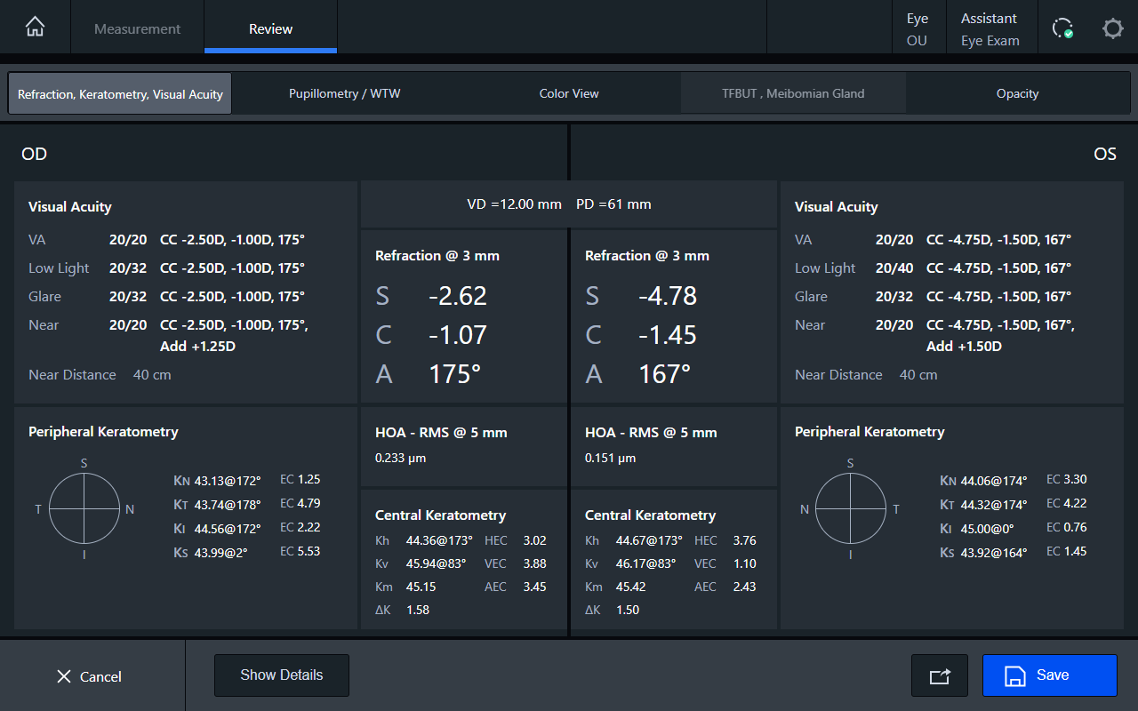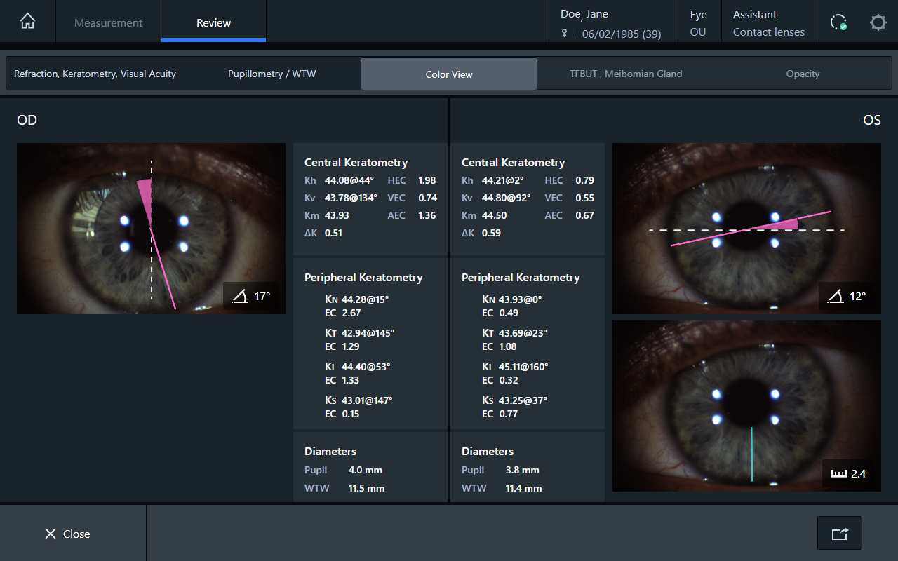 Die Wellenfrontrefraktion wird durch eine Vielzahl von Messfunktionen ergänzt, die über die Refraktionsergebnisse hinausgehen und einen umfassenden Einblick in den Augenstatus ermöglichen: