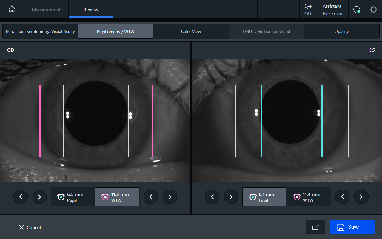 Die bei der Pupillometrie und WTW (white-to-white) aufgezeichneten Schwarz-Weiß-Bilder können zur Bestimmung der Pupillen- und der Hornhautgröße verwendet werden.